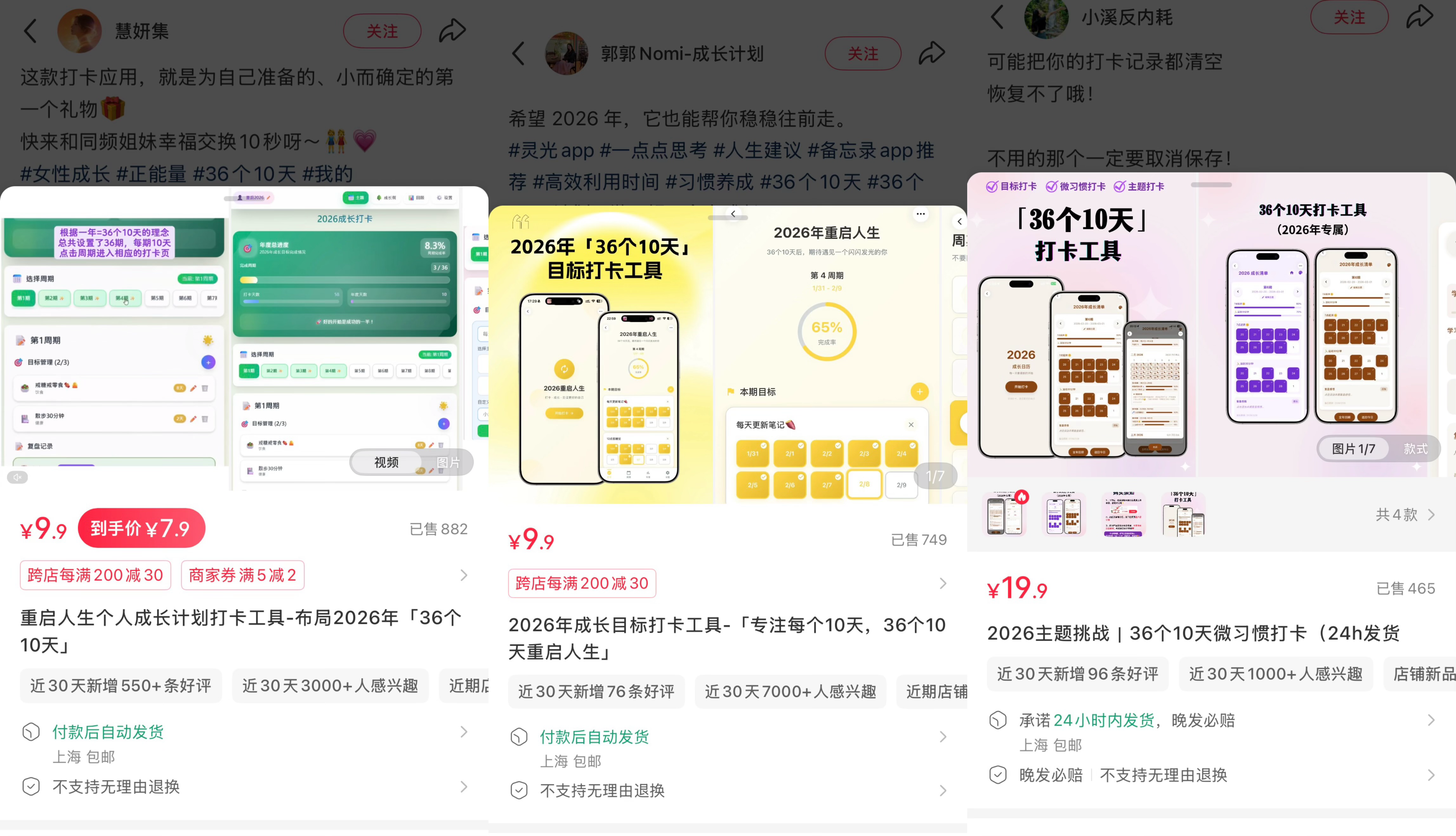 有多位网友在社交平台分享并出售他们通过灵光App手搓的闪应用,单个小应用成交量从百单到千单。这些闪应用生成门槛非常低,网友通过自然语言和灵光App对话,0成本创作,不会写代码也能搓出一个可交互的小应用。因其制作便捷,不受赛道限制,被当下年轻人发展成了一门“生意”。譬如,有用户手搓了主题为“36个10天”的个人成长目标打卡小工具用来督促自己成长,随后将其在个人店铺上架,不仅累计获得了近千笔订单,还得到了大量好评,购买者评价“操作界面简单、没有乱七八糟广告”。据不完全统计,在某社交平台,用灵光手搓出来的个人成长主题的小应用已售出数千单。
