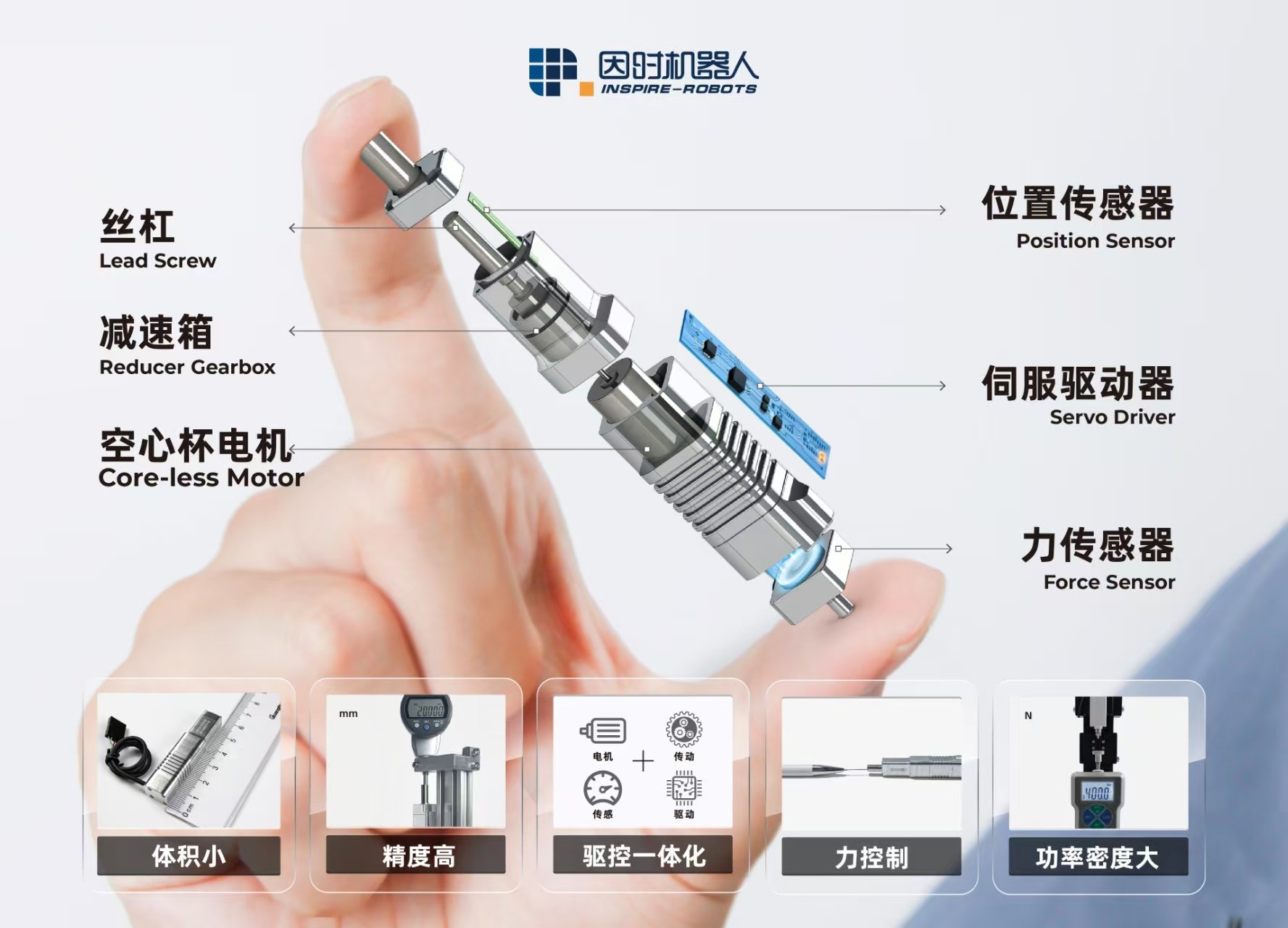微型伺服电缸是集精密机械、伺服控制与传感技术于一体的创新产品,具有体积小、精度高、负载大等特点,能够实现行程范围内任意位置精确伺服控制,包括精确位置控制、速度控制、力控制及力位混合多种控制方式,是机器人及工业自动化等精密机电设备的核心运动部件。其技术亮点包括:
