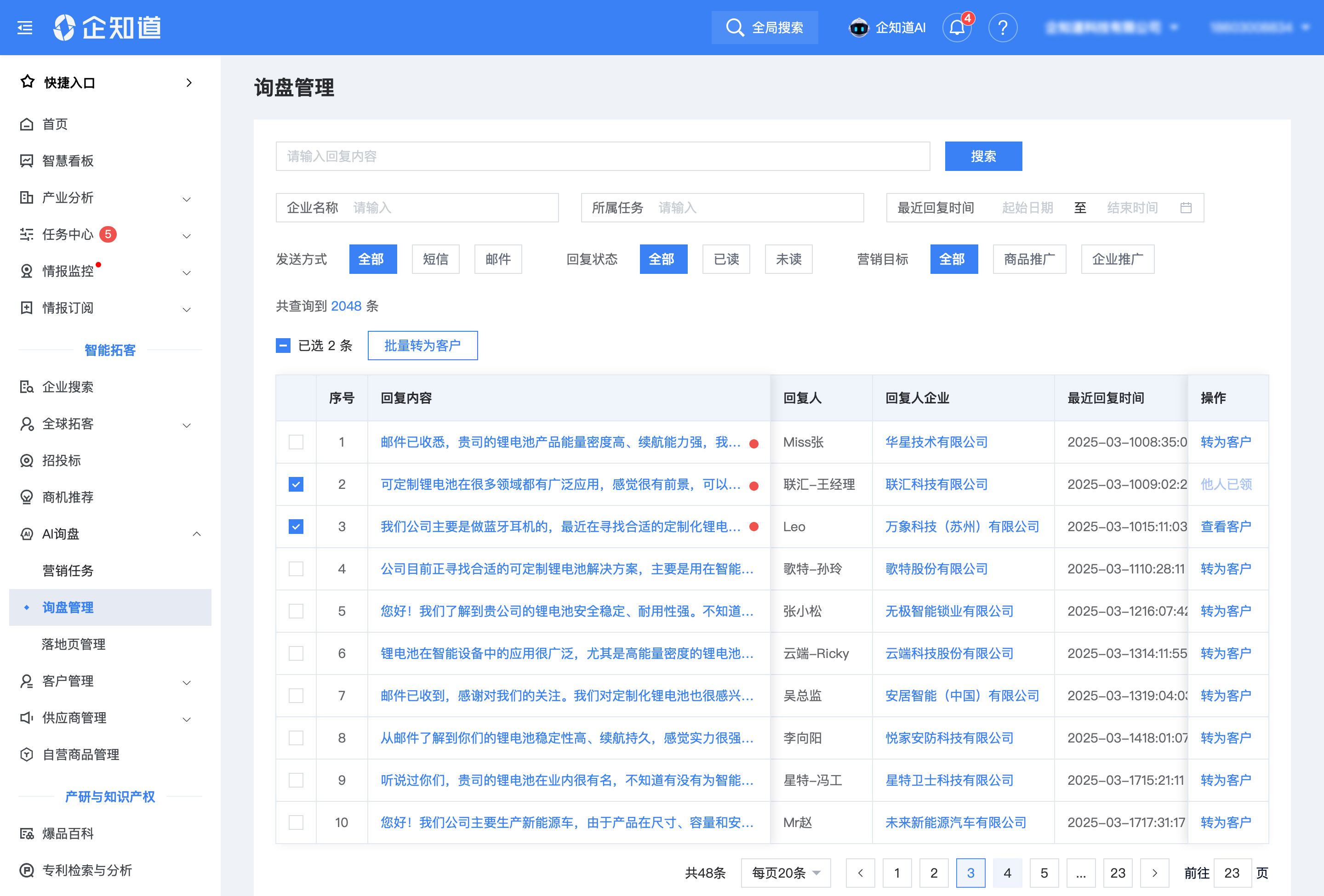 科创空间依托独有的全球企业信息库,提供产业链、主营产品、海关数据、招投标、地图定位等多种找客户形式:AI智能撰写营销内容,短信、邮件一键触达客户,高效获得询盘线索;全国招投标信息实时追踪,支持按预算/行业/关键词多维度订阅招标项目。
