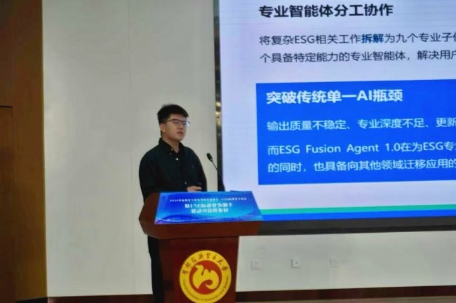 首都经济贸易大学可持续发展研究院助理研究员傅博文随后发布《基于多智能体协同的ESG智能系统研究—中国ESG研究院ESG Fusion Agent 1.0》。该系统基于多智能体协同架构,将数据采集、指标提取、风险管理、报告生成等九大专业智能体统一调度,实现了ESG相关工作从原始数据到专业报告的全流程自动化。系统内置ESG专家预设的指标体系与风险规则库,可动态更新知识库、智能适配大语言模型,显著提升ESG工作效率与输出质量,为ESG研究、企业实践与政府监管提供了数字化支撑。